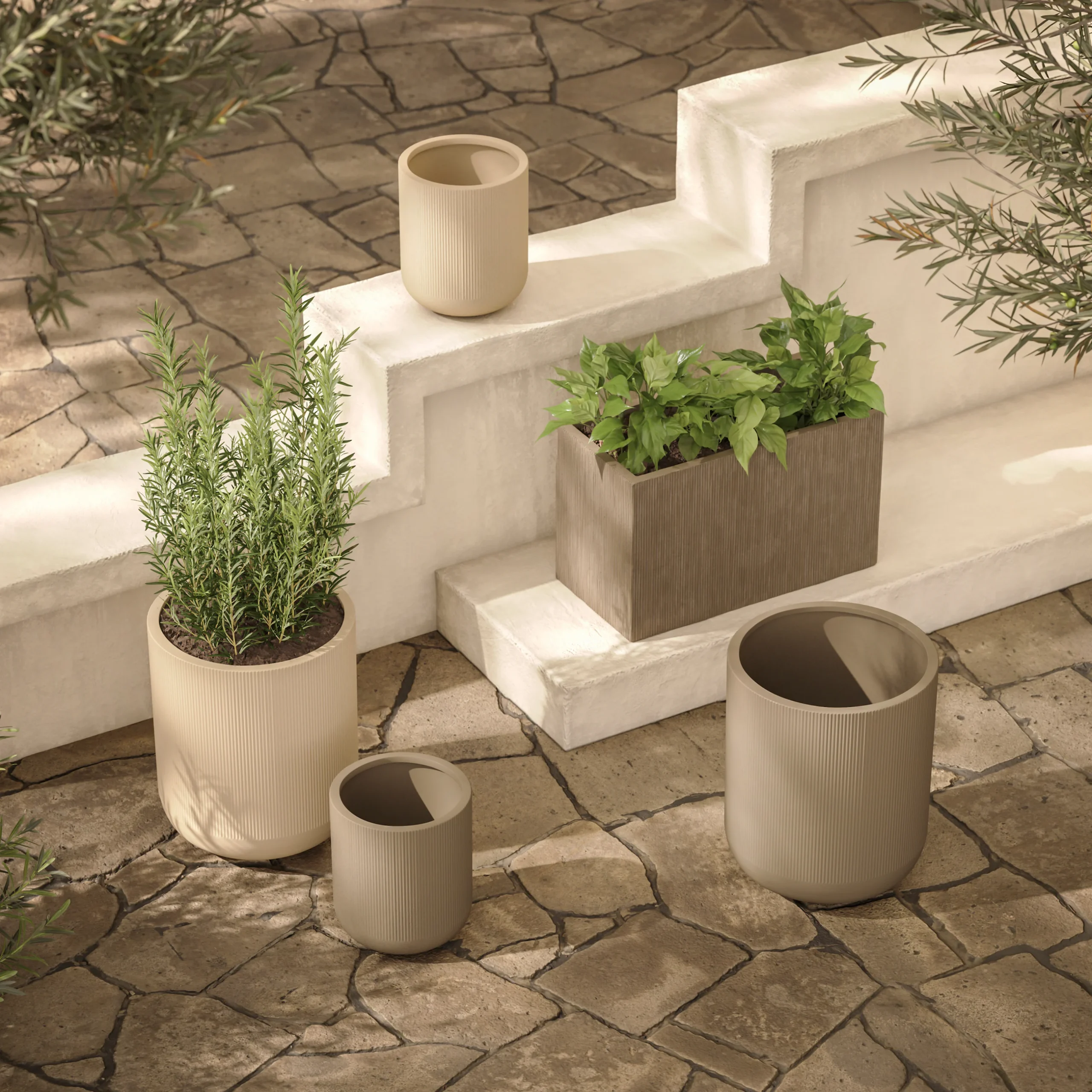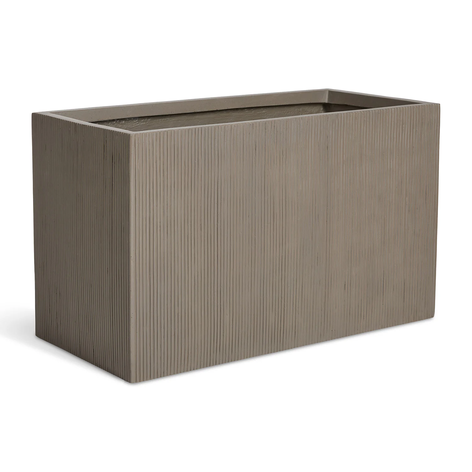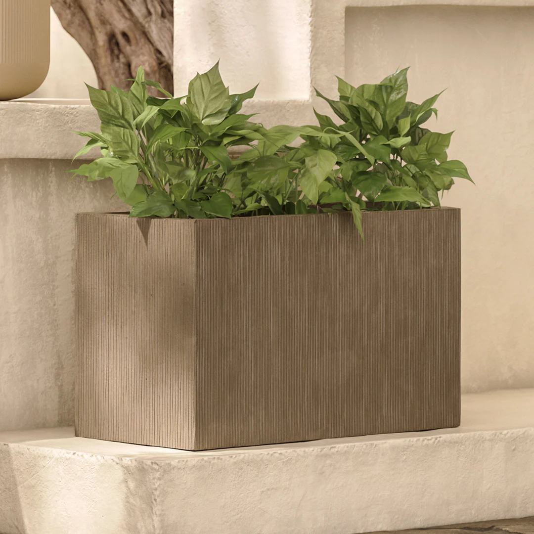 A sleek concrete planter with soft fluted texture and a rectangular shape, Reya is built for indoor and outdoor plant parenting—with a built-in drainage hole and a modern gray finish.